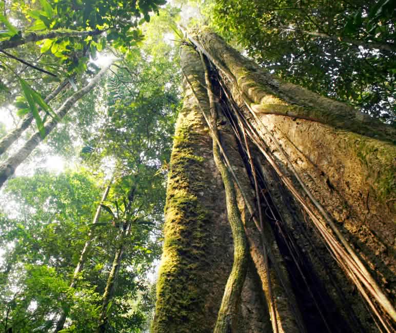 Studien zufolge binden Regenwälder 250 Milliarden Tonnen Kohlenstoff in ihren Bäumen. Das entspricht global betrachtet dem 22-fachen der menschengemachten Treibhausgas-Emissionen pro Jahr.