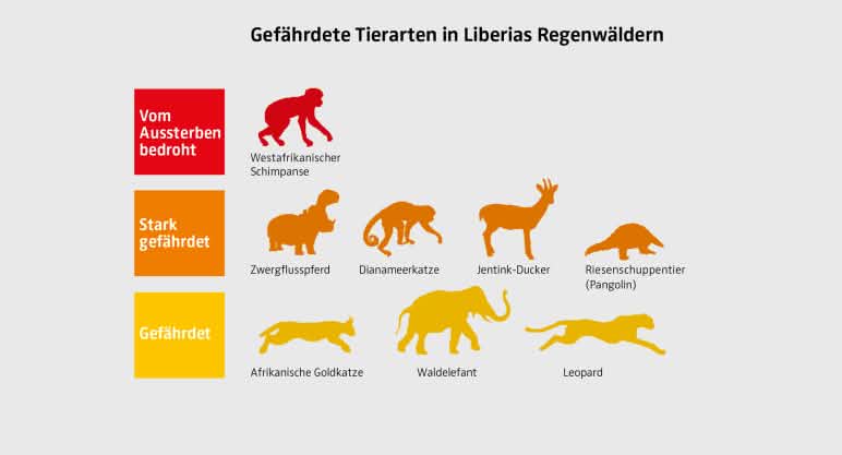 Ein wesentlicher Teil ihrer Arbeit findet zudem in den Dörfern statt. Dort sensibilisieren sie im Auftrag der Wild Chimpanzee Foundation (WCF) die Bewohner für die Schönheit und Zerbrechlichkeit der Regenwälder ringsum. Wie wichtig das ist, zeigt die Liste der bedrohten Tierarten, die im Grebo-Krahn Nationalpark leben: Schimpansen, Waldelefanten, Zwergflusspferde, Leoparden und viele andere. Obwohl Liberias Wälder zu den artenreichsten der Welt gehören, gibt es in dem Land lediglich drei Nationalparks. Der 2017 gegründete Grebo-Krahn ist der jüngste unter ihnen.